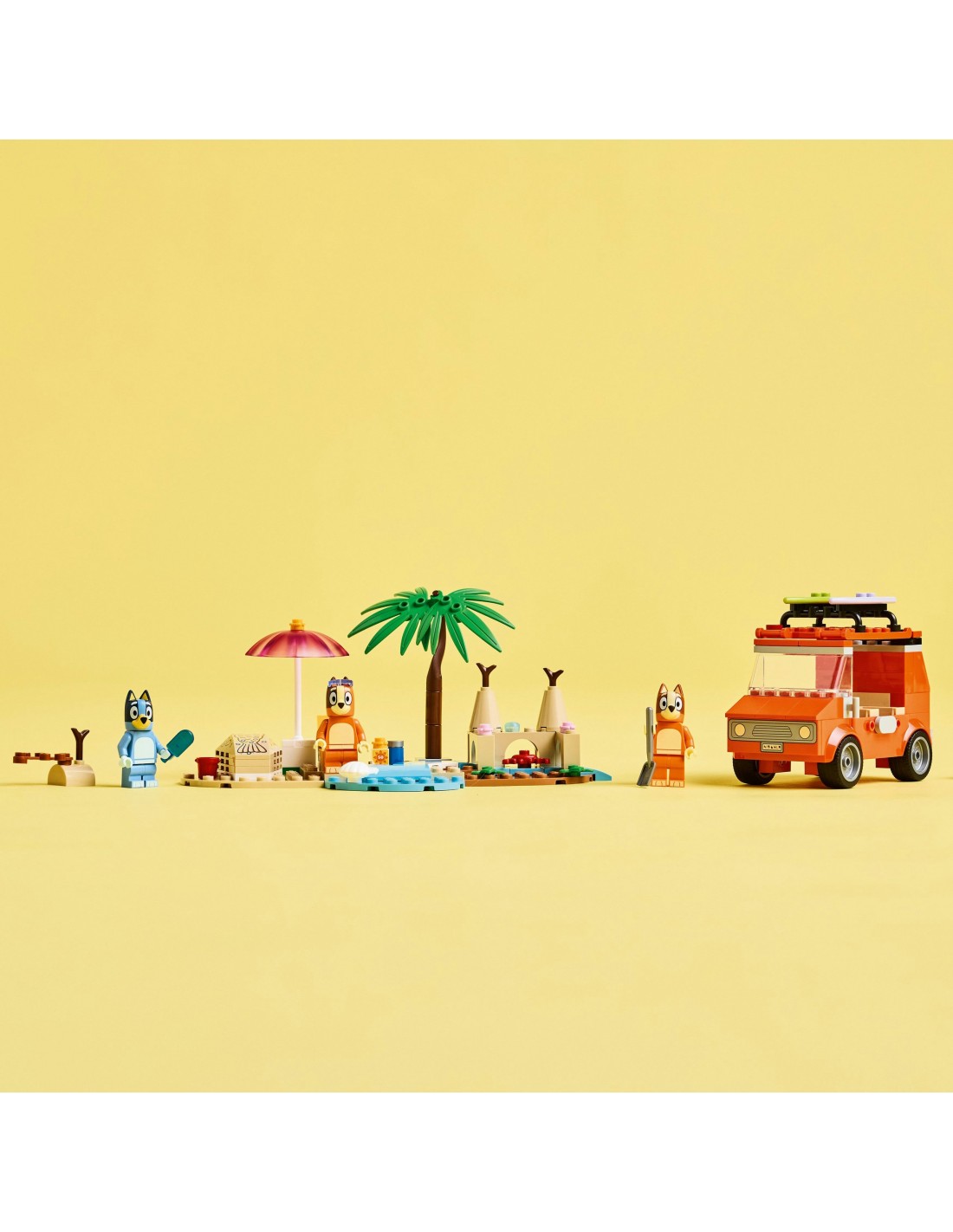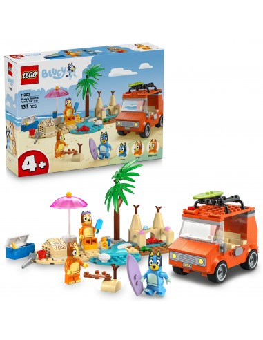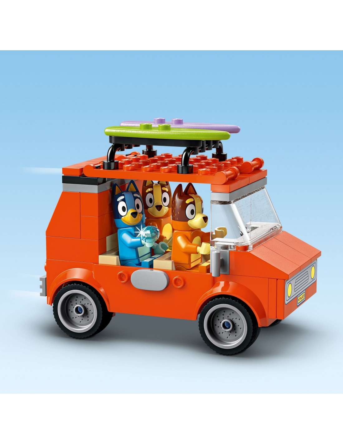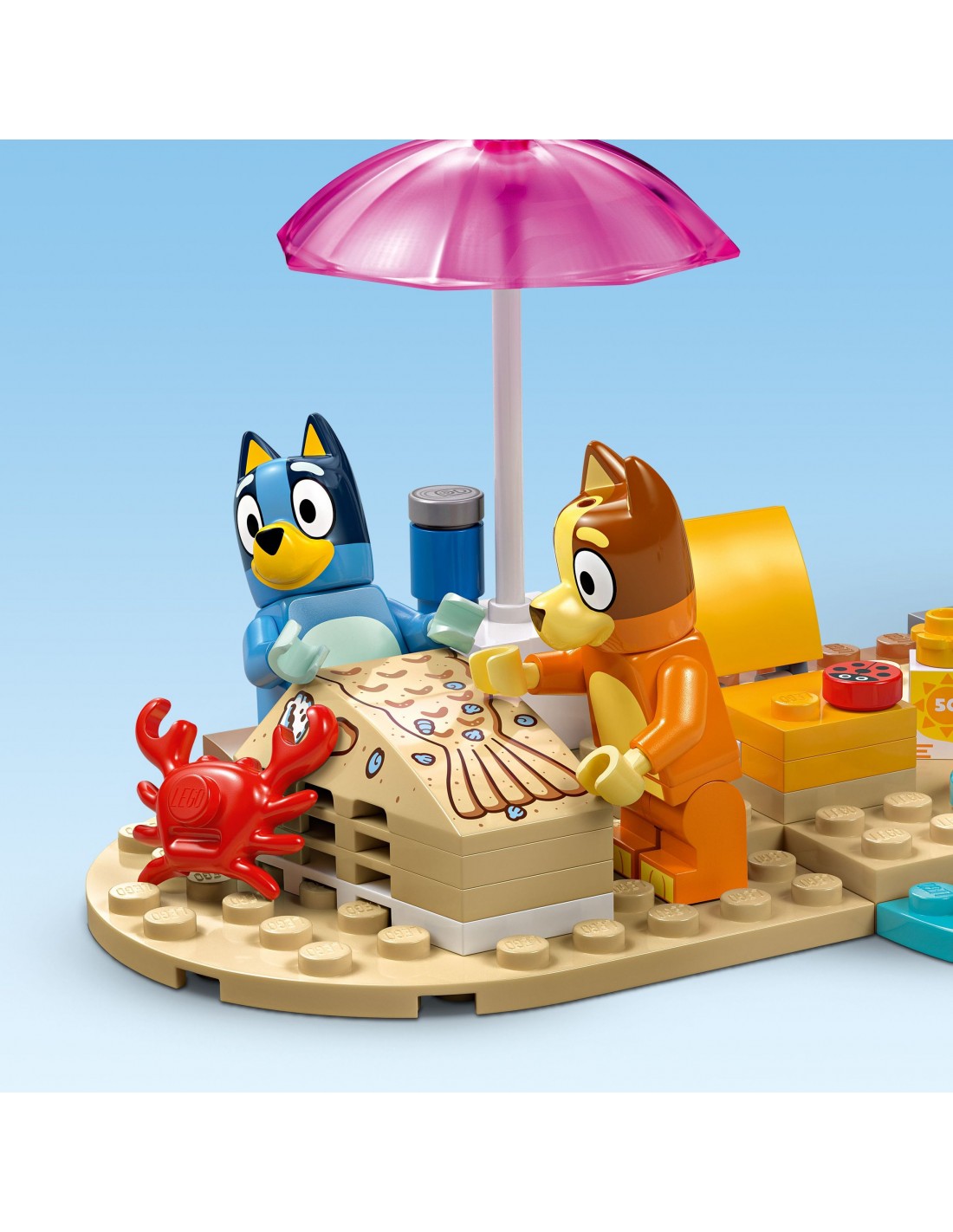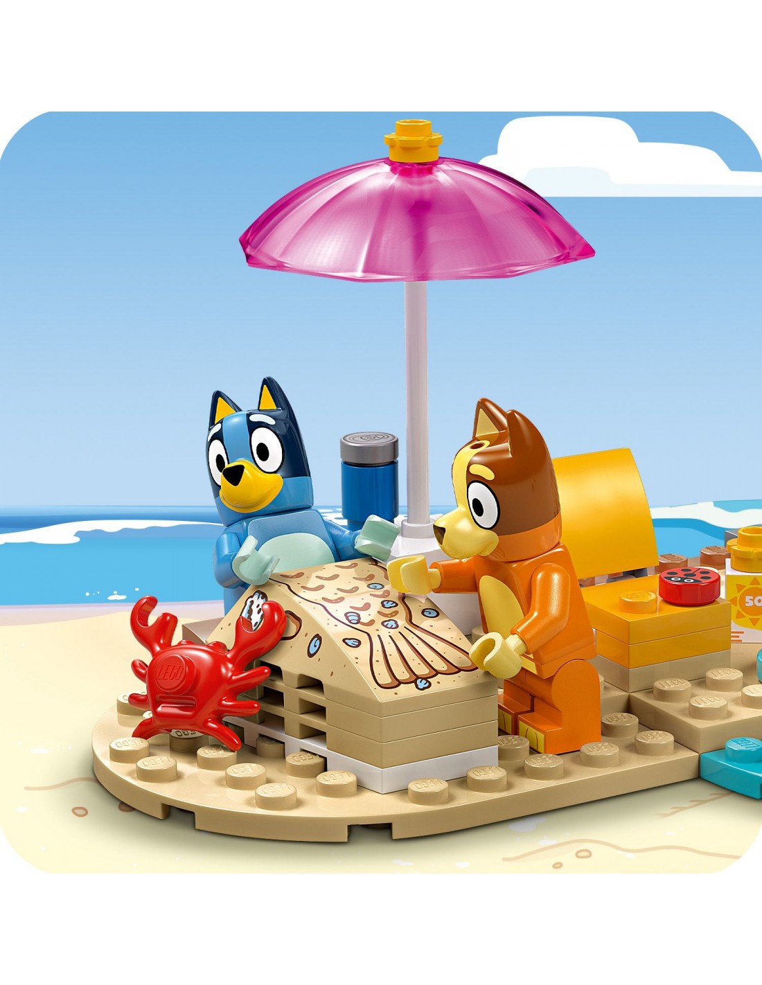 - Interaktywna zabawka konstrukcyjna dla dzieci — ten zestaw zawiera minifigurki LEGO®, pojazd i wiele interaktywnych elementów, dzięki czemu dzieci spędzą pełny frajdy dzień na plaży z Blue, Bingo i mamą