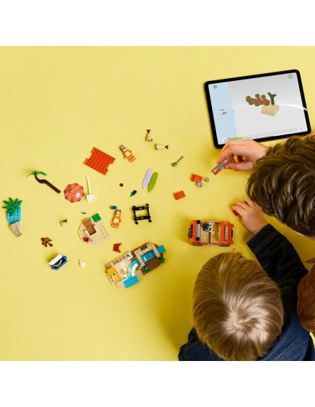 Ta zabawka LEGO® zawiera kultowy pojazd z serialu Blue, z dwiema deskami surfingowymi przymocowanymi do dachu i bagażnikiem z tyłu, w którym można umieścić lodówkę.