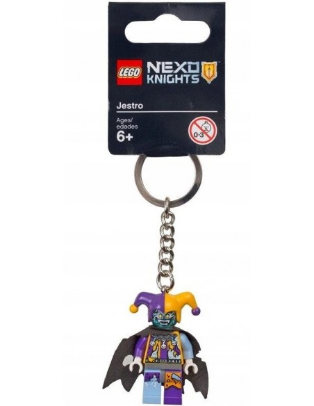 - Zestaw zawiera oryginalną minifigurkę Jestro z LEGO® NEXO KNIGHTS™. Postać ma na sobie płaszcz, czapkę błazna i rysunek trupiej czaszki na piersi. Całość zamocowana jest do solidnego metalowego kółka z łańcuszkiem.