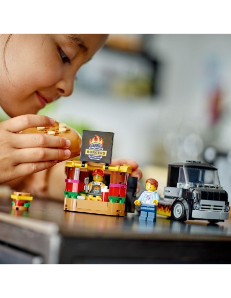 Załaduj ciężarówkę z burgerami i jedź do popularnej dzielnicy w LEGO® City. Otwórz budkę, aby pochwalić się znakiem z grillowanymi burgerami, przejdź do kuchni i zaserwuj swoim klientom najpyszniejsze dania w mieście. Po skończonej pracy wskocz za kierownicę i przenieś się w inne miejsce!