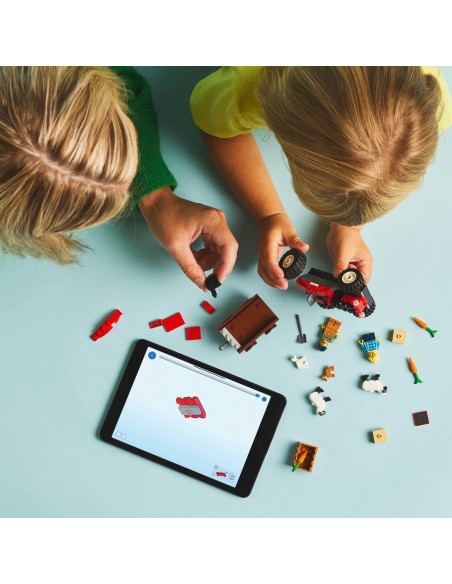 Łatwy do zbudowania zestaw z traktorem zawiera klocek startowy, ilustrowane instrukcje oraz instrukcje 3D w aplikacji LEGO Builder — cyfrowym narzędziu do przybliżania i obracania modelu, które pomaga dzieciom zwizualizować gotowy model z różnych perspektyw.