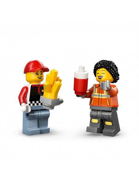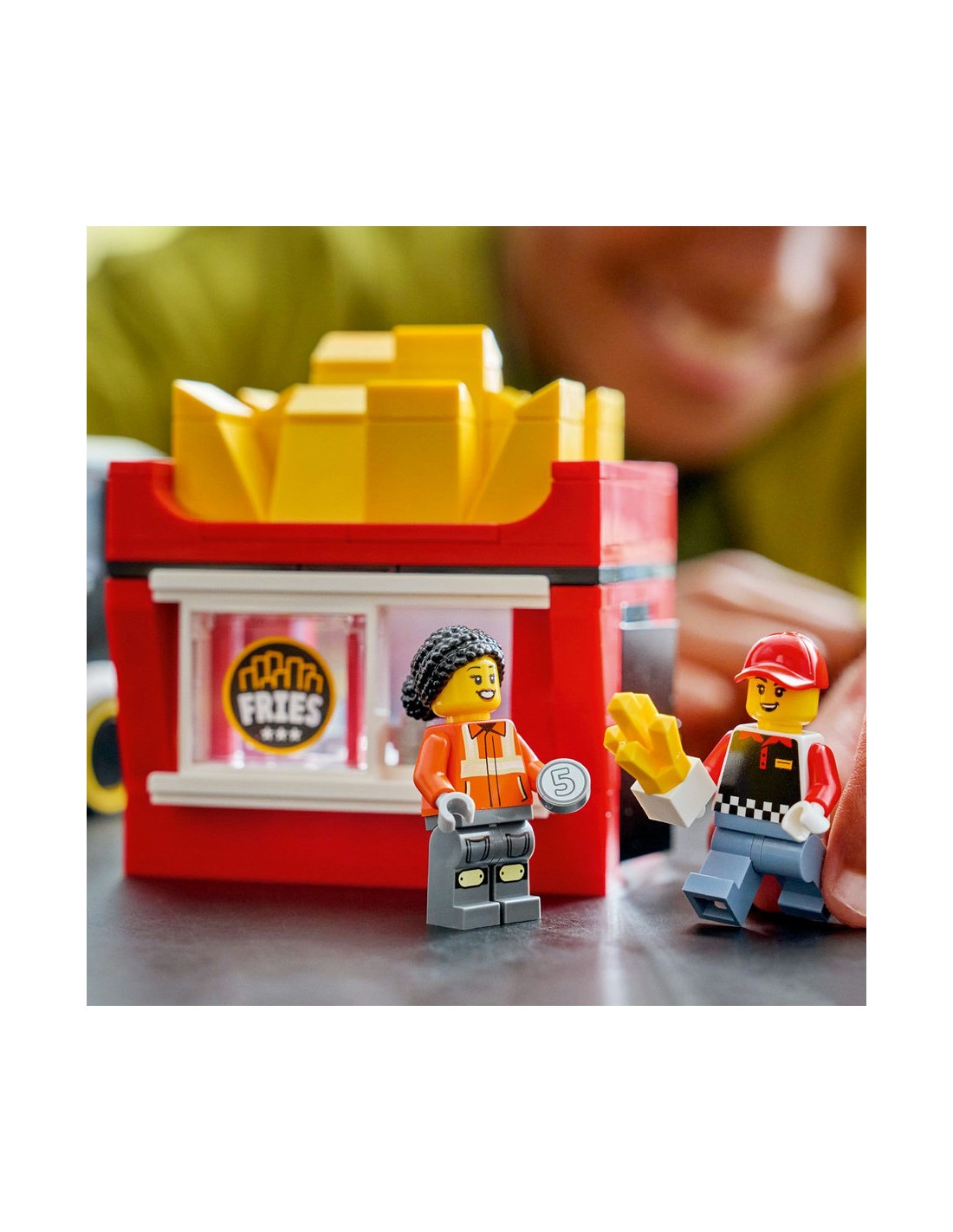 - Zawartość pudełka — zawiera wszystko, czego dzieci potrzebują do zbudowania zabawkowego food trucka z frytkami LEGO® City, a także minifigurki sprzedawcy i klienta oraz akcesoria