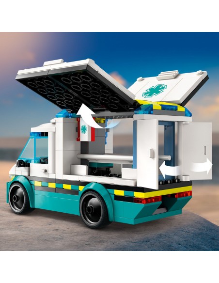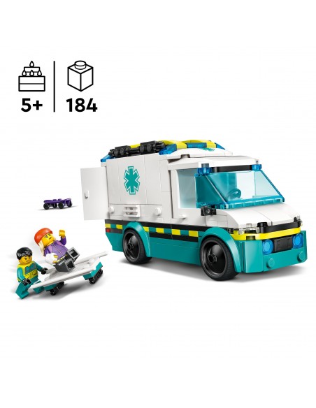 Podczas zabawy zestawem LEGO® City Karetka pogotowia na pięciolatków i starsze dzieci czekają ekscytujące misje ratunkowe. Dzieci mogą rozłożyć boczne panele i otworzyć tylne drzwi, aby uzyskać łatwy dostęp do noszy i sprzętu medycznego, w tym strzykawki, bandaża i torby medycznej.