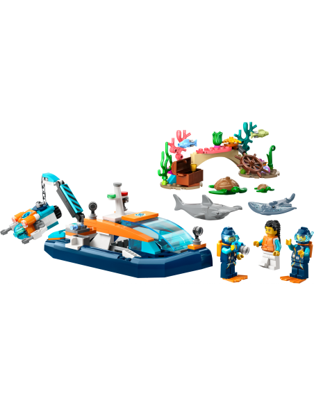 Pływająca łódź zabawkowa ma wiele realistycznych funkcji, w tym działający dźwig. Zestaw zawiera też małą łódź podwodną, scenerię rafy koralowej i skrzynię ze skarbami. W zestawie są trzy minifigurki badaczy oraz płaszczka, rekin młot, krab, dwie ryby i dwie figurki żółwi, a także mnóstwo inspirujących akcesoriów.