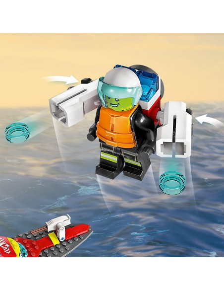 Co jest w pudełku? – Wszystko, czego potrzebują dzieci do zbudowania łodzi strażackiej i motorówki, a także cztery minifigurki z akcesoriami, w tym plecakiem odrzutowym