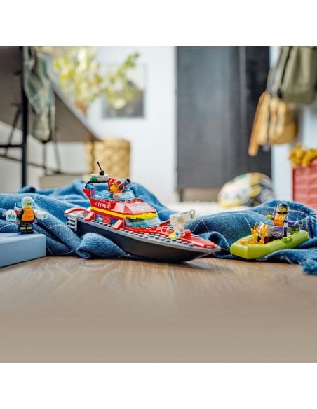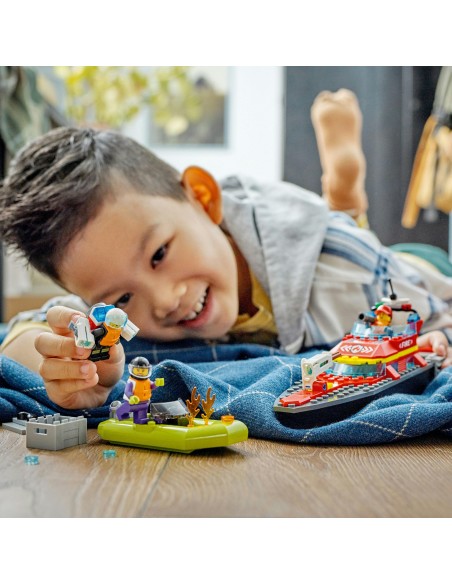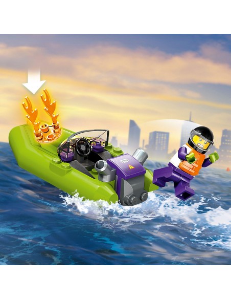 O rany! Na motorówce wybuchł pożar, a kapitan wyskoczył za burtę! Wezwij na pomoc łódź strażacką. Przemierzaj fale, by pomóc kapitanowi. Następnie wyślij strażaka z plecakiem odrzutowym, aby użył gaśnicy na łodzi i stłumił płomienie. Dokąd udadzą się w następną misję? W LEGO® City to Ty o tym decydujesz!