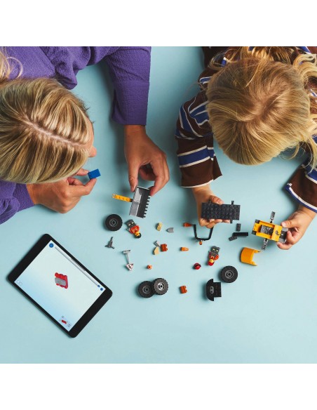 Łatwy do zbudowania zestaw z pojazdem budowlanym zawiera klocek startowy, ilustrowane instrukcje oraz instrukcje 3D w aplikacji LEGO Builder — cyfrowym narzędziu do przybliżania i obracania modelu, które pomaga dzieciom zwizualizować gotowy model z różnych perspektyw.