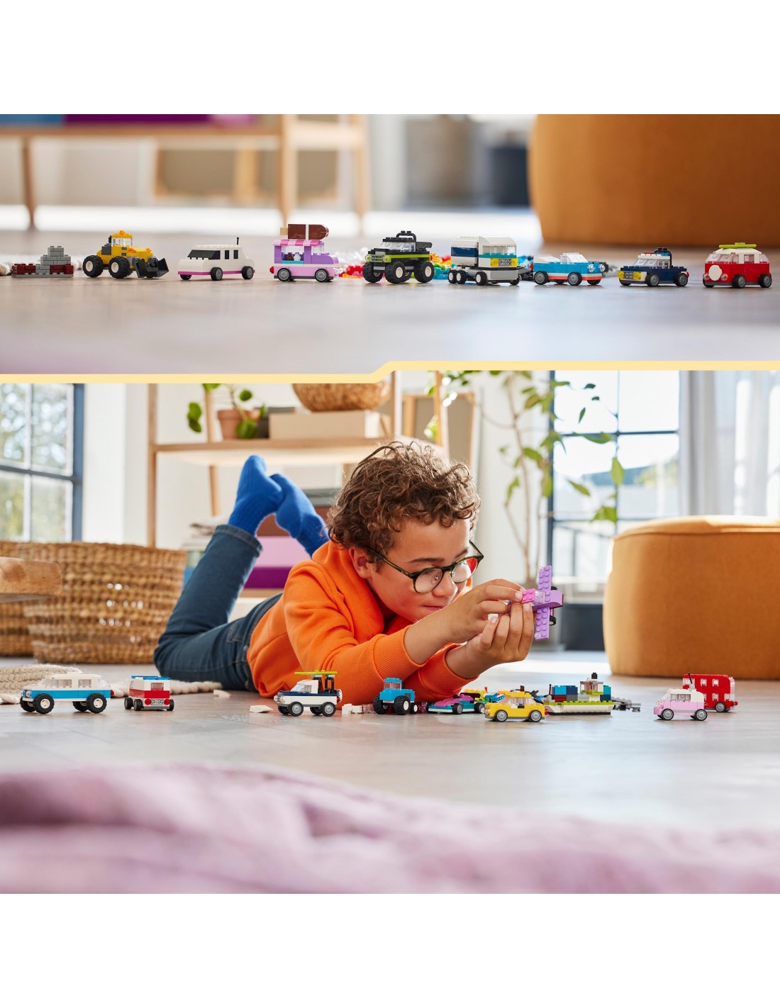 Dzięki 900 klockom, elementom specjalnym i 52 kołom oraz prostym instrukcjom dzieci mogą zbudować zabawkowy radiowóz, furgonetkę z lodami, quada, koparkę, ciężarówkę, samochód kombi, terenówkę i limuzynę. Następnie, korzystając z pomysłów na różne projekty, fajne detale i kolorowe dekoracje, dzieci mogą przebudować swoje pojazdy. W miarę rozwijania się ich umiejętności kreatywnego budowania dzieci mogą wymyślać własne projekty. Do zestawu dołączono inspiracje oraz 10 pomysłów, dzięki którym najmłodsi od razu rozpoczną zabawę.