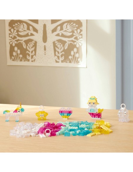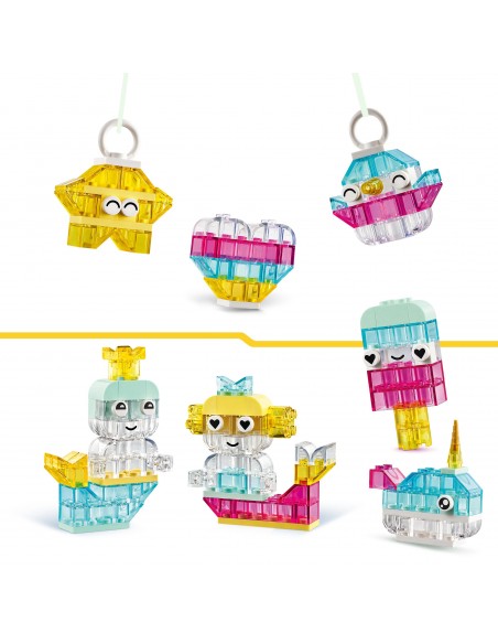 Przezroczyste klocki, elementy z oczami i buziami oraz klocki z wieszakami do ekspozycji dodają blasku i dodatkowej kreatywnej zabawy do dziecięcych dzieł.