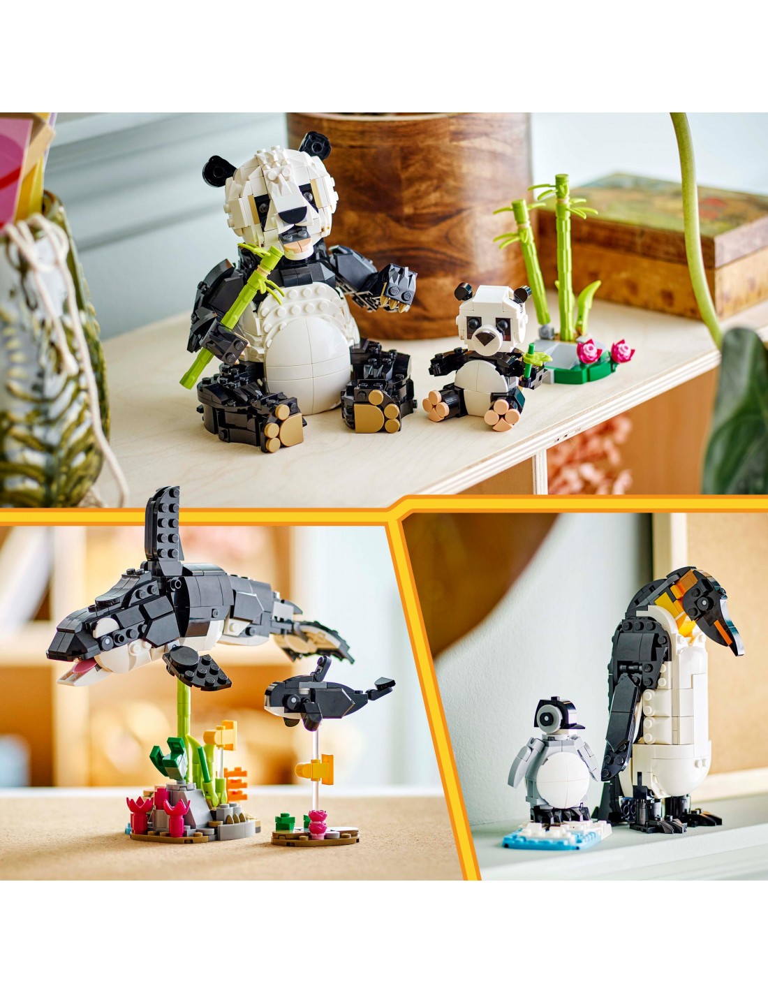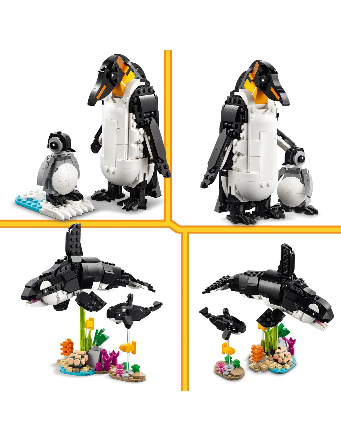 Dzieci mogą zbudować jeden z trzech modeli LEGO® z tego samego zestawu klocków: ruchomą pandę z młodym obok łodyg bambusa, ruchomą orkę z dzieckiem, które można ustawić na przezroczystych podstawkach lub ruchomego pingwina z pisklęciem na kawałku lodu i wody. Wszystkie trzy sceny sprawdzą się podczas zabawy i ustawiania na półce. Ten zestaw to świetny pomysł na prezent dla dzieci.