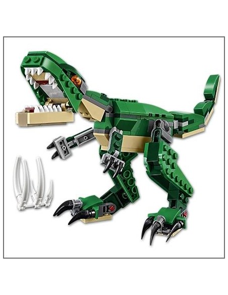 Ten zestaw da Ci mnóstwo świetnej zabawy! Znajdziesz w nim T-Rexa z ruchomymi łapami i głową, wielkimi szponami oraz otwierającą się paszczą uzbrojoną w spiczaste zęby. Dinozaur jest koloru ciemnej zieleni i beżu i ma jasnopomarańczowe oczy. W zestawie znajdziesz też resztki ofiary dinozaura w postaci klatki piersiowej do złożenia. LEGO® Creator Potężne dinozaury to zestaw typu „3 w 1”: model można przerobić na triceratopsa lub pterodaktyla.