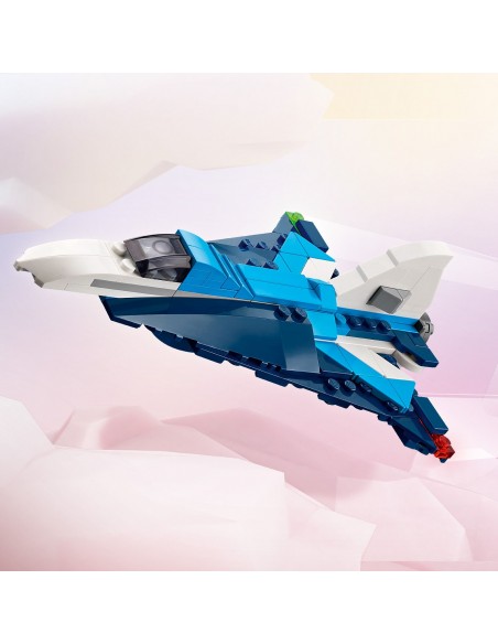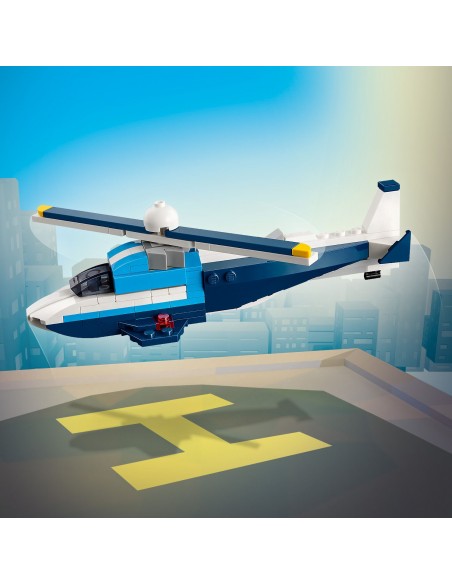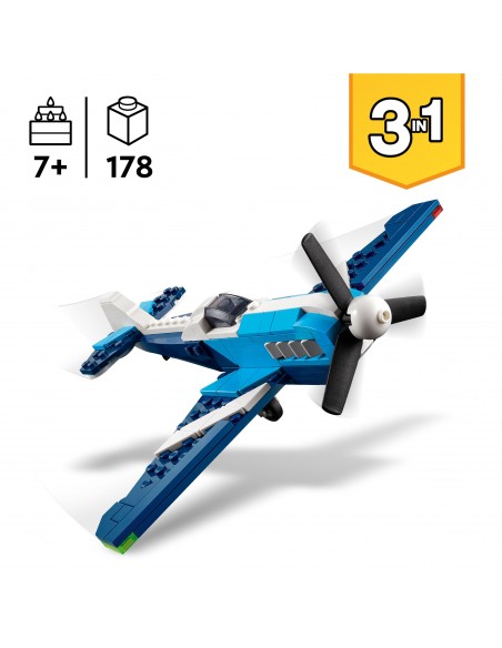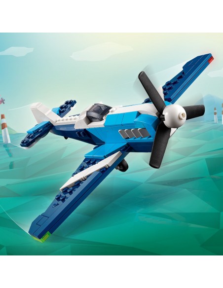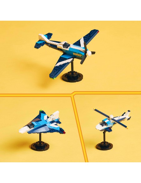 Dzięki zestawowi LEGO Creator 3 w 1 Statek powietrzny: samolot wyścigowy na siedmiolatków i starsze dzieci czekają superszybkie przygody w przestworzach. Model samolotu ma obrotowe śmigło z przodu i ruchome koła, dzięki czemu może jeździć po ziemi, a także podstawkę z klocków do ekspozycji.