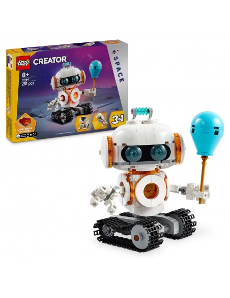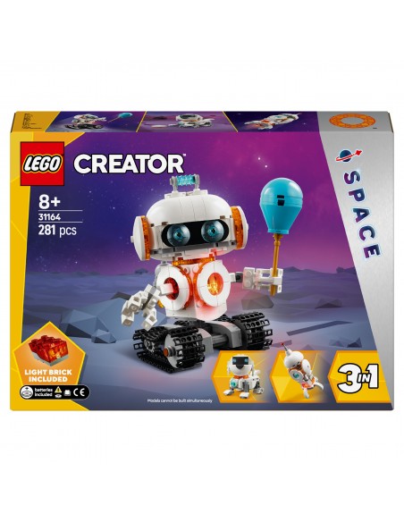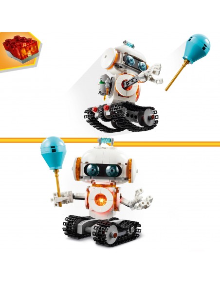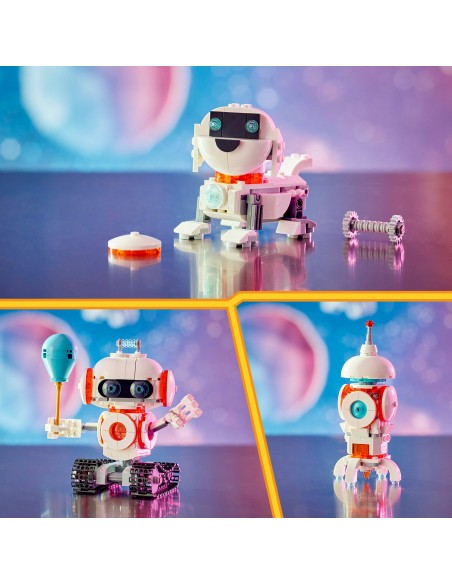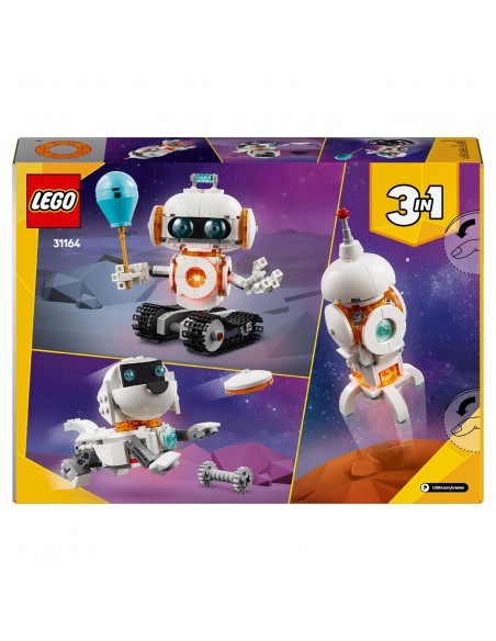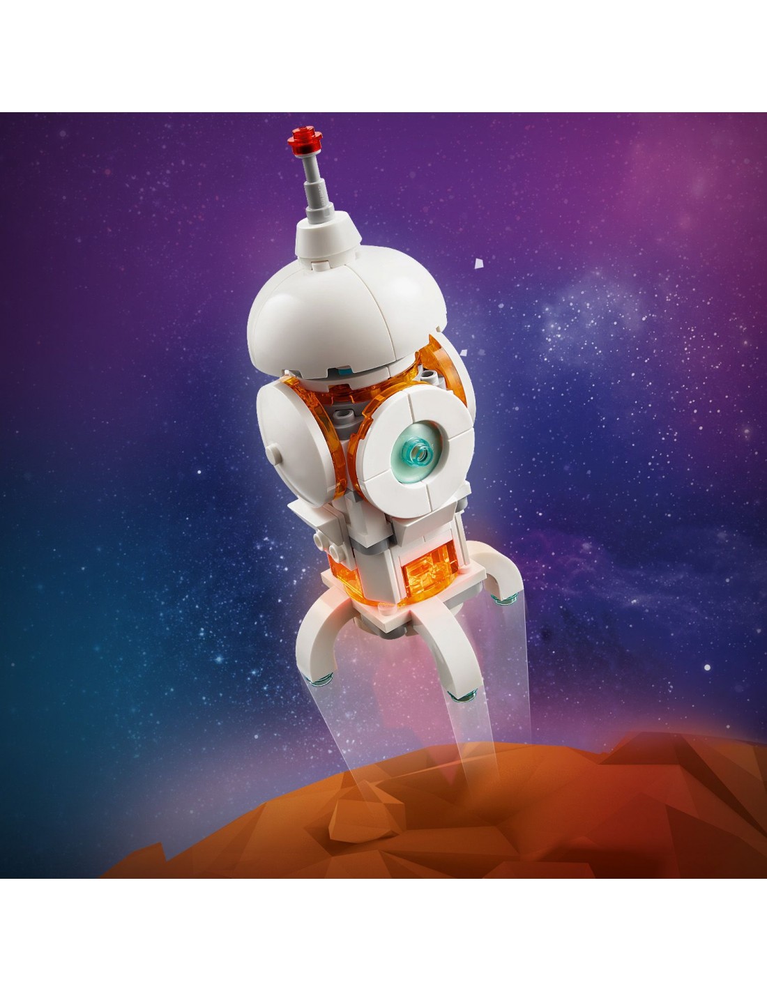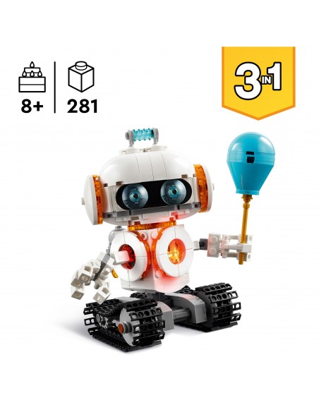 Dzięki temu zestawowi LEGO Creator 3 w 1 Kosmiczny robot ośmiolatki i starsze dzieci mogą odgrywać międzygwiezdne historie. Robot jest osadzony na ruchomych gąsienicach i ma plecak odrzutowy, balon i świecący klocek, który oświetla jego tułów. Ponadto figurka ma obrotową głowę i ciało oraz ruchome ręce i palce.