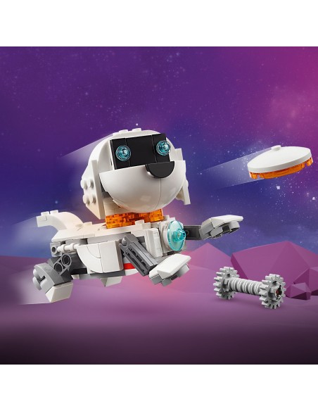 Fani LEGO mogą zbudować i przebudować trzy różne kosmiczne figurki z tych samych klocków: robota na ruchomych gąsienicach, psa z kością i latającym dyskiem lub rakietę kosmiczną. Wszystkie trzy modele zawierają świecący klocek, który można aktywować po naciśnięciu przycisku (baterie w zestawie). Kosmiczny zestaw do zabawy i ozdoby świetnie sprawdzi się jako prezent.