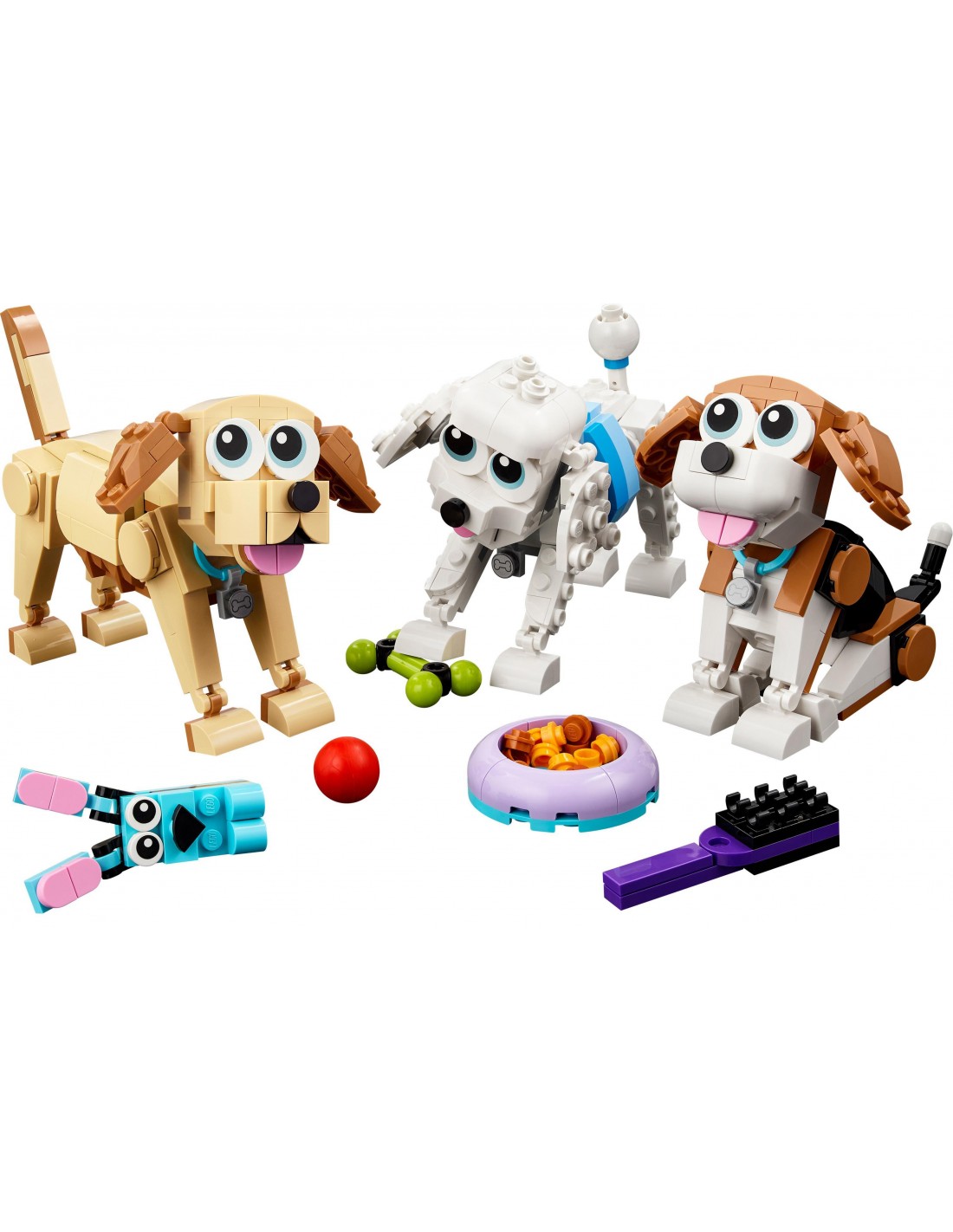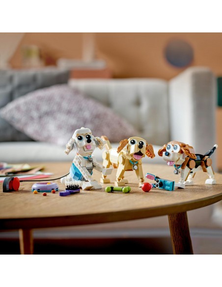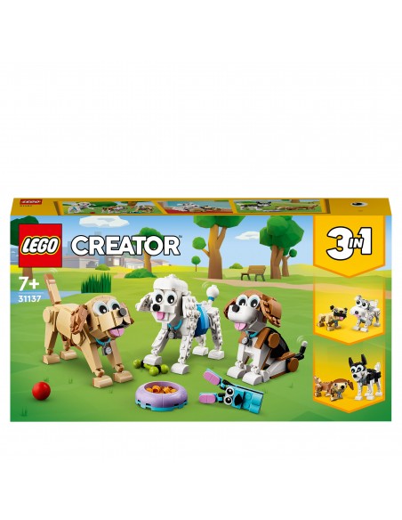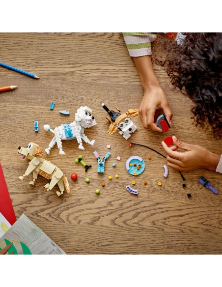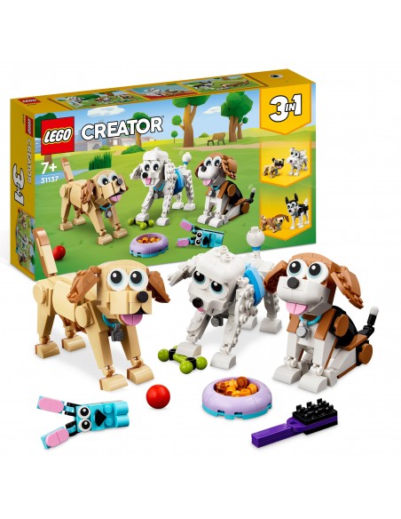 Miłośnicy psów i dzieci w wieku od siedmiu lat mogą bawić się uroczymi pieskami z zestawu LEGO® Creator 3 w 1 Urocze psiaki (31137). Zawiera on beagle’a, pudla i labradora z ruchomymi głowami, ogonkami i uszami, a także akcesoria, w tym miskę, szczotkę, zabawkowego królika, piłkę i smycz, aby urozmaicić wymyślane przez dzieci historie.