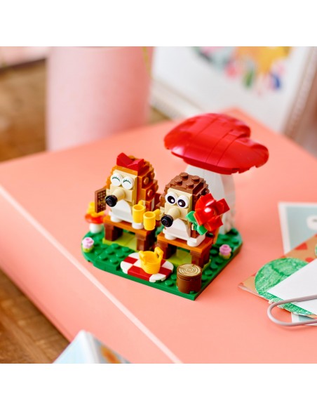 Zestaw konstrukcyjny LEGO® Piknik pary jeżyków (40711) z mnóstwem funkcji nadaje się na każdą okazję. Ośmiolatki i starsze dzieci mogą zbudować, ustawić na półce i bawić się zestawem z dwoma jeżykami siedzącymi pod grzybem w kształcie serca z podstawką również w kształcie serca
