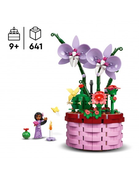 Zestaw zawiera doniczkę w kształcie koszyka na zawiasach, którą można otworzyć, odsłaniając ukryty pokój pełen ciekawych szczegółów znanych z filmu, minilaleczkę Isabeli LEGO ǀ Disney oraz kwiaty LEGO do zbudowania — orchideę i kaktusa, które po zamknięciu doniczki można ułożyć w twórczy sposób.