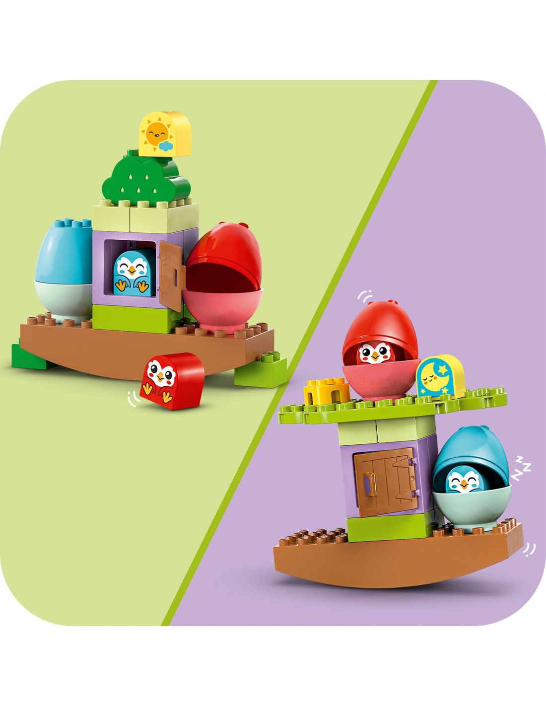 Dzięki klockowi pokazującemu noc i dzień dorośli mogą zapoznać dzieci z nocnymi ptakami, które są aktywne w nocy, a w dzień śpią w jajkach. Maluchy rozwijają koordynację wzrokowo-ruchową, otwierając jajka i dopasowującje kolorystycznie do sówek. Zestaw można przebudowywać na wiele sposobów, aby wspierać kreatywność i wytrwałość dzieci.
