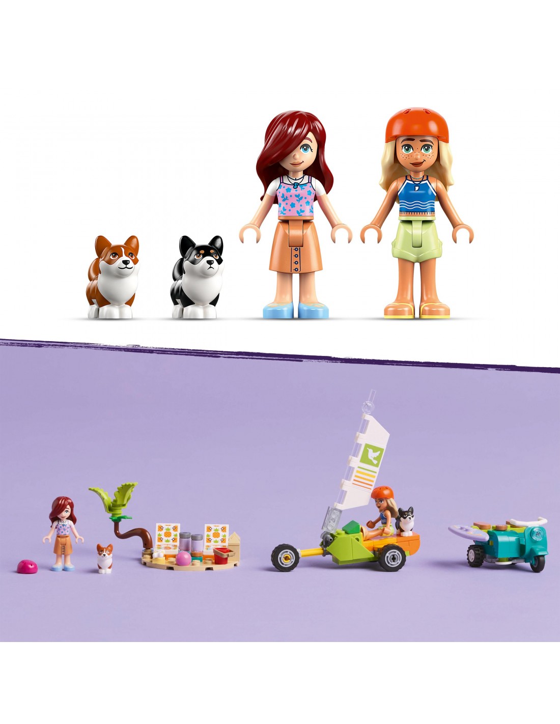 Dwa pojazdy LEGO® — zestaw zawiera skuter i żaglowóz do zbudowania, każdy z miejscem na minilaleczkę i figurkę psa, a także miniaturową deskę surfingową dla piesków corgi