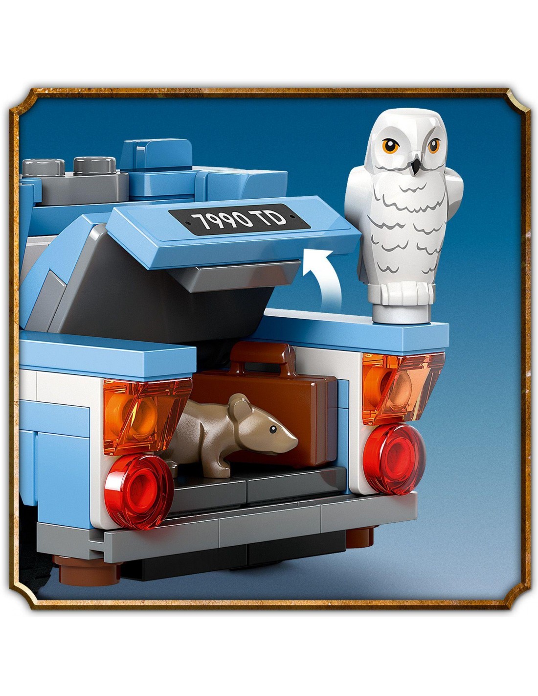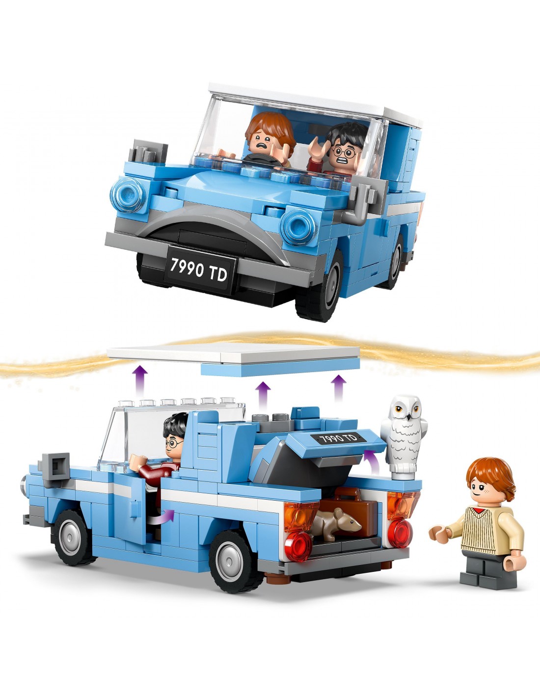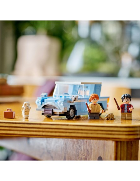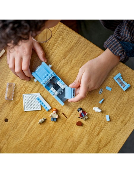 Samochód zbudowany z klocków LEGO® ma otwierane drzwi i zdejmowany dach, dzięki czemu z łatwością można umieścić w nim minifigurki Harry'ego Pottera i Rona Weasleya™ oraz figurkę sowy Hedwigi™.