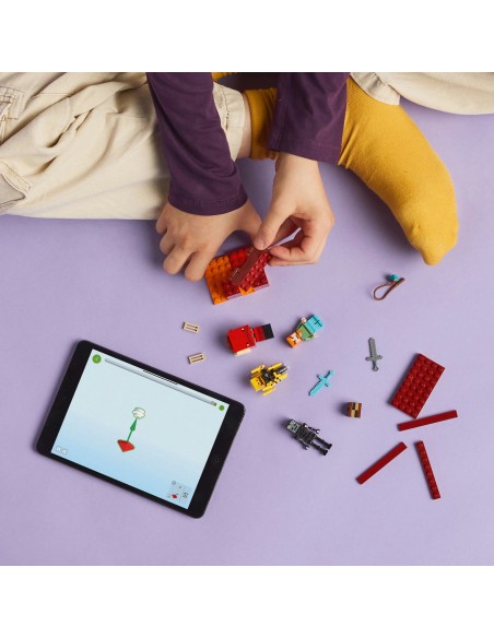 Akcja w Fortecy Netheru z LEGO® Minecraft® — gracze wykorzystają swoje umiejętności, aby zebrać pradawne zgliszcza, uniknąć lawy, walczyć z mobami i uciec na figurce w poszukiwaniu bezpiecznego schronienia