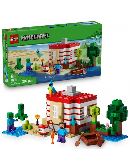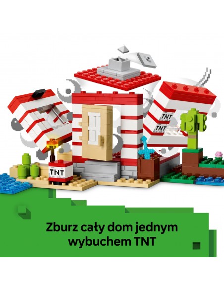 Dom do zbudowania jest umieszczony w biomie dżungli i kształtem przypomina kultowy element TNT z gry Minecraft. Przełącznik z boku pozwala dzieciom uruchomić funkcję eksplozji TNT, która niszczy całą konstrukcję. Gdy opadnie kurz, dzieci mogą odbudować budynek i rozpocząć nową przygodę. W zestawie są minifigurki LEGO® Minecraft Steve’a, Creepera™ i zombie, które inspirują do zabawy w odgrywanie scenek i bitew. Realistyczne akcesoria LEGO Minecraft, takie jak łódź, wędka, ryba, papuga i roślinność urozmaicają zabawę.