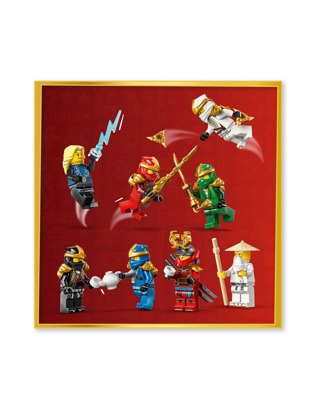 - Osiem minifigurek NINJAGO® — zestaw zawiera osiem postaci z pierwszego sezonu serialu: Kaia, Zane’a, Cole’a, Jaya, Lloyda, Wu, Samuraia X oraz Mistrzynię Błyskawic na osobnej podstawce