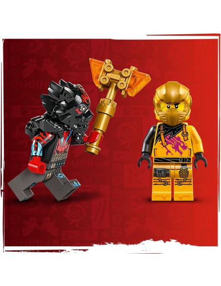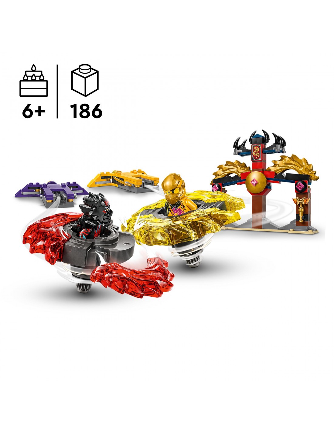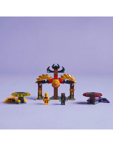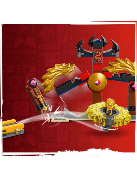 Zestaw Smocze Spinjitzu — zestaw bitewny umożliwia sześciolatkom i starszym dzieciom odgrywanie niesamowitych akcji z trzeciego sezonu serialu NINJAGO Powstanie Smoków. Ten mały zestaw LEGO® zawiera świątynię areny, dwie minifigurki Arina i Rasa oraz dwa smocze spinnery Spinjitzu, które dzieci mogą umieścić w wyrzutniach i wystrzelić je, by ze sobą walczyły.