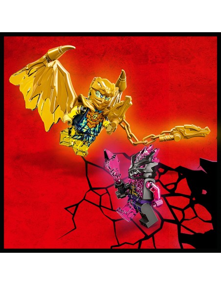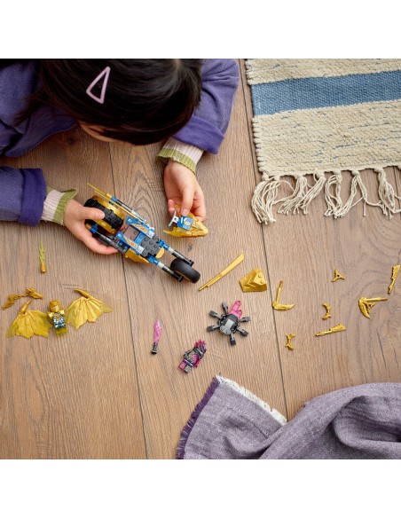 Rusz do walki na złotym smoczym motocyklu Jaya, tylko uważaj na groźnego kryształowego pająka i wojownika Kamienia Zemsty uzbrojonego w miecz, bo przeciwnicy są gotowi do ataku. Użyj niesamowitej mocy złotego smoczego motocykla, aby odzyskać broń żywiołów Jaya. Zbierz w sobie siłę, pokonaj złoczyńców i ocal miasto NINJAGO®!