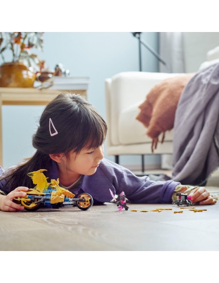 Zestaw LEGO® NINJAGO® Złoty smoczy motocykl Jaya (71768) zawiera wszystko, czego fani w wieku od siedmiu lat potrzebują do odgrywania porywających scen z serialu NINJAGO: Crystallized. Model motocykla NINJAGO ma głowę złotego smoka z ruchomą paszczą i złote panele boczne.