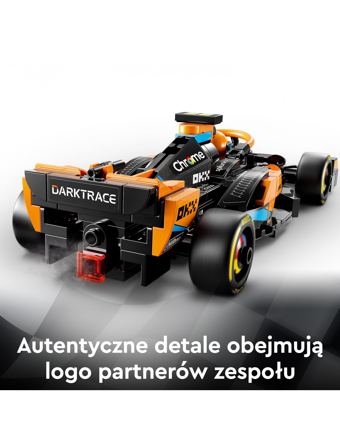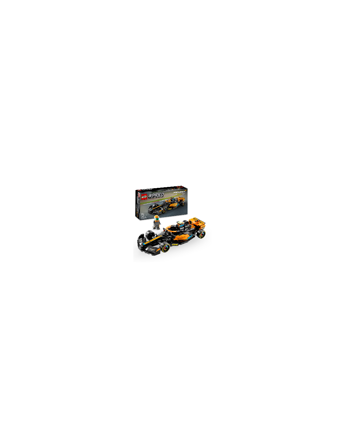 Model samochodu McLarena zawiera wiele realistycznych elementów: czarno-pomarańczowe barwy, logo sponsorów zespołu, koła z nadrukiem Pirelli i pomarańczowy system bezpieczeństwa halo. Zestaw do zbudowania zawiera także minifigurkę kierowcy, którą dzieci mogą umieścić za kierownicą i wziąć udział w ekscytujących wyścigach.
