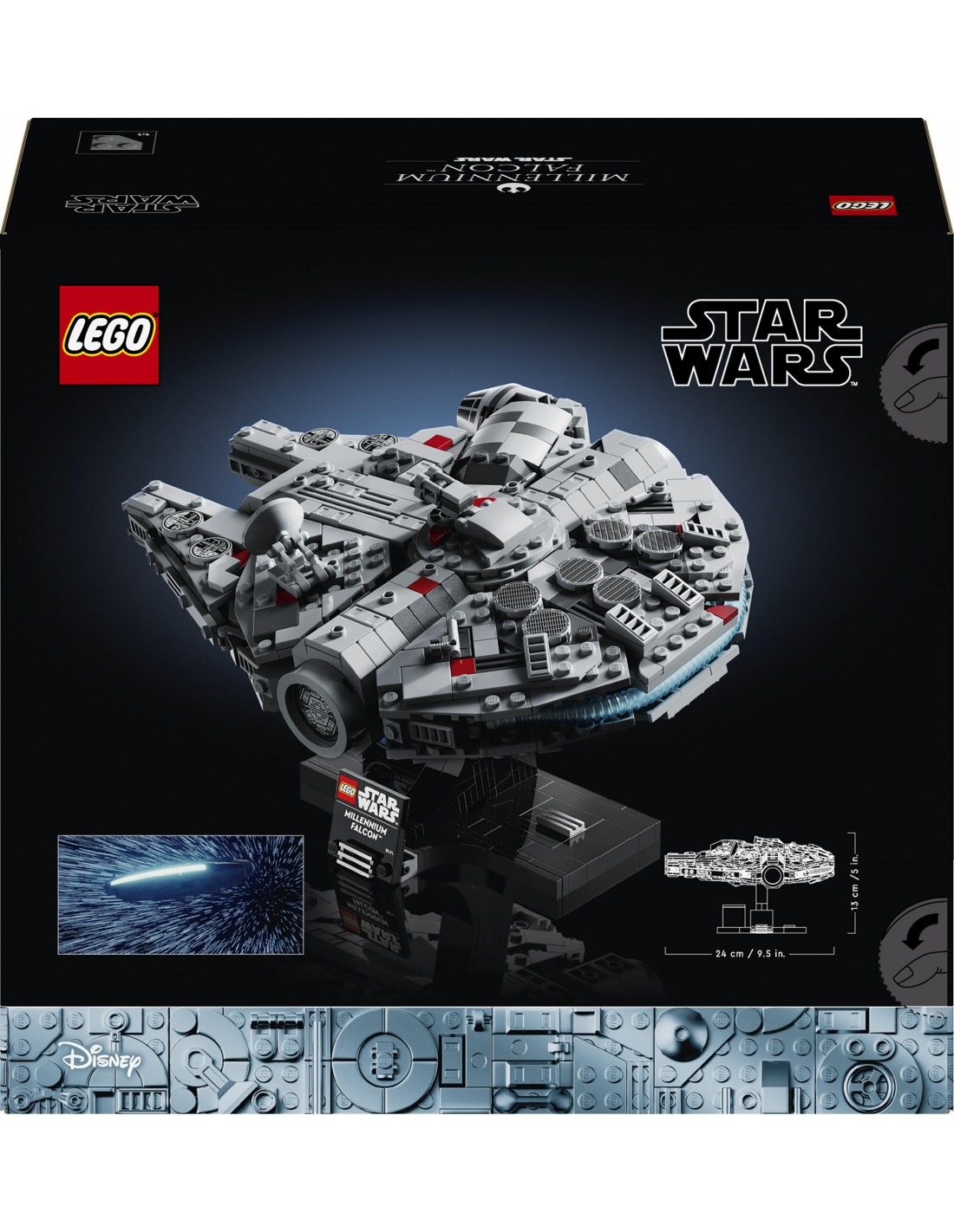 Buduj i postaw na półce — statek kosmiczny LEGO® Star Wars™ Sokół Millennium ma 13 cm wysokości, 24 cm długości i 19 cm szerokości.