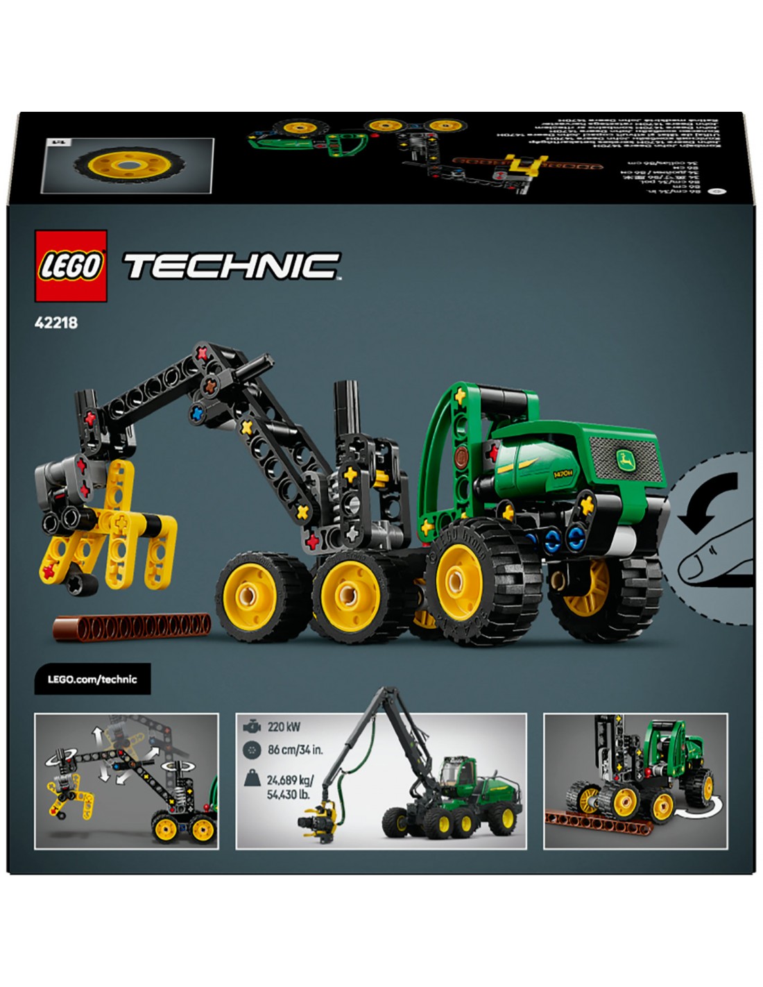 - Zabawkowy harwester — LEGO® Technic Harwester kołowy John Deere 1470H (42218) z obrotowym wysięgnikiem i działającym chwytakiem dla chłopców, dziewczynek i dzieci w wieku od siedmiu lat, którzy uwielbiają pojazdy budowlane