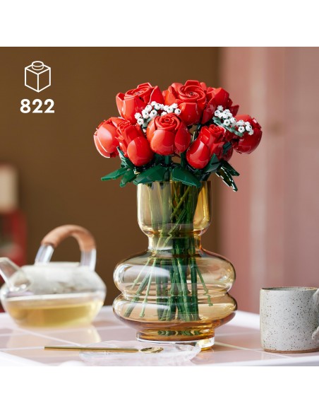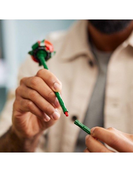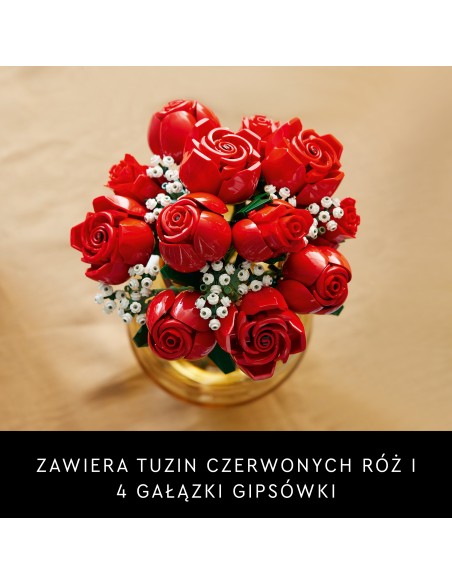 Budowanie tego bukietu LEGO sprawi Ci radość. To tuzin czerwonych róż, w tym cztery w pełnym rozkwicie, cztery kwitnące i cztery pąki z długimi zielonymi łodygami do ułożenia w wazonie, a także cztery gałązki gipsówki z małymi białymi kwiatami. Łatwy do złożenia bukiet stanowi elegancką ozdobę dowolnego pomieszczenia i można go łączyć z innymi zestawami z kolekcji botanicznej LEGO.