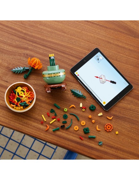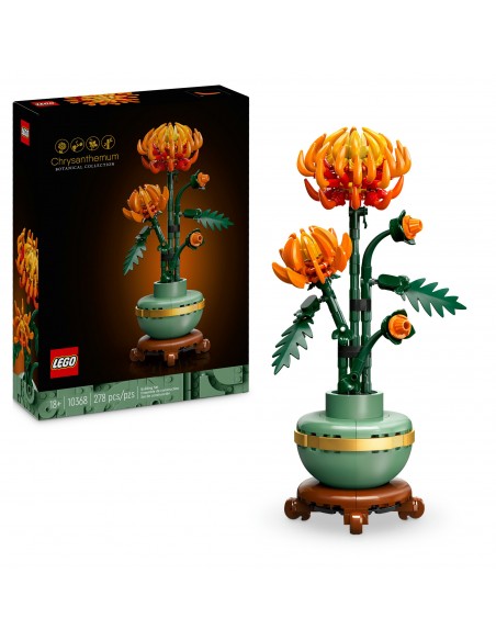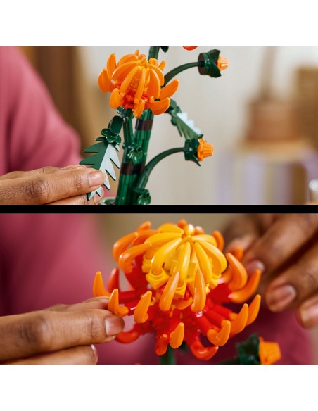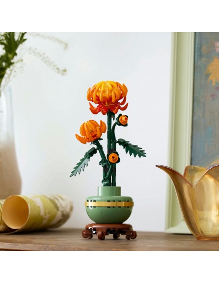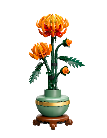 Ta szczegółowa replika z ruchomymi liśćmi i płatkami przedstawia jaskrawopomarańczowy kwiat w formie pąka, rozkwitającego kwiatu i w pełni rozkwitu. Do zestawu dołączona jest pastelowa zielona doniczka ozdobiona złotą obwódką i cokołem z efektem drewna. Łatwy w budowaniu model chryzantemy stanowi elegancką ozdobę każdej przestrzeni i będzie się świetnie prezentować w towarzystwie innych zestawów z kolekcji botanicznej LEGO (sprzedawanych osobno).