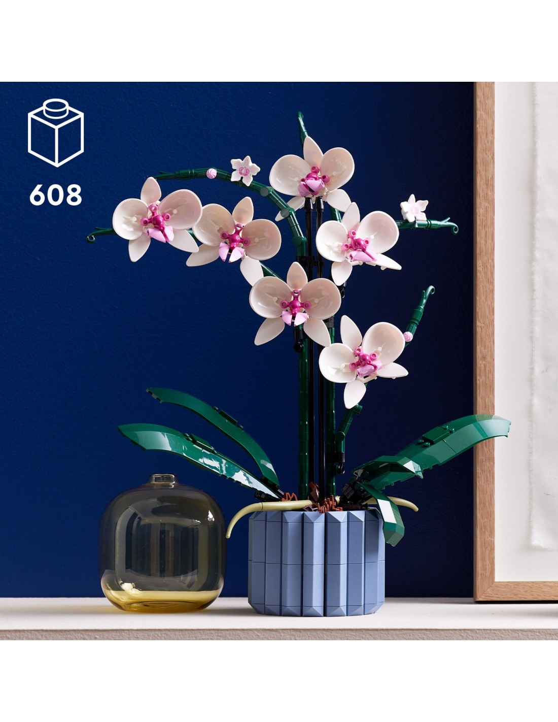 Bez pośpiechu złóż z klocków wszystkie szczegóły biało-różowych kwiatów i wazonu. Inspirowany prawdziwymi orchideami model ma pięć liści u podstawy oraz dwa ruchome korzenie powietrzne, które nadają roślinie realistyczny wygląd. Niebieski żłobkowany wazon złożony z klocków można wypełnić brązowymi elementami LEGO przedstawiającymi podłoże z kory, w którym rosną prawdziwe orchidee.