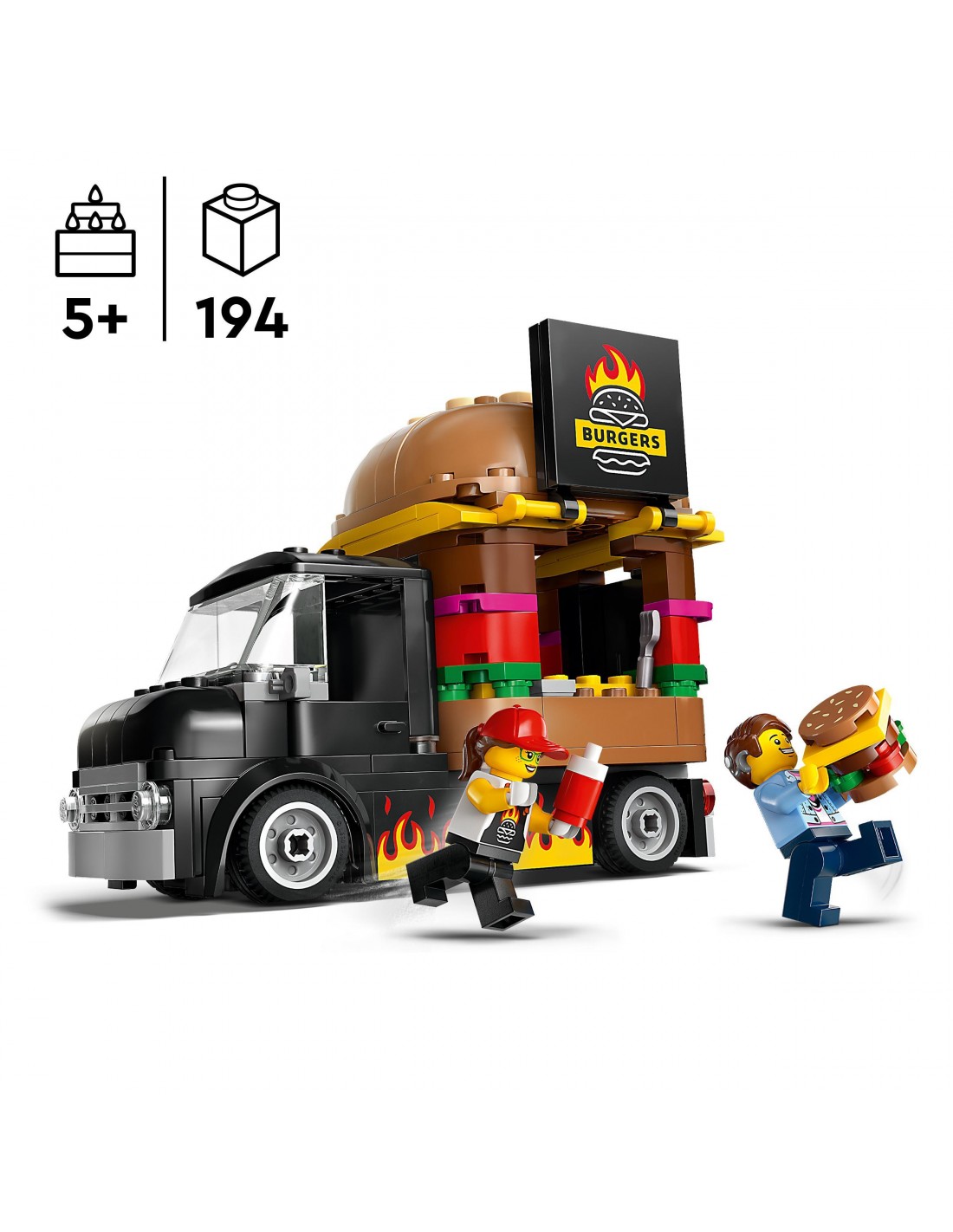Zestaw LEGO® City Ciężarówka z burgerami (60404) dla pięciolatków i starszych dzieci pobudzi ich wyobraźnię. Mobilny fast food z wielkim burgerem na dachu można odczepić od ciężarówki.