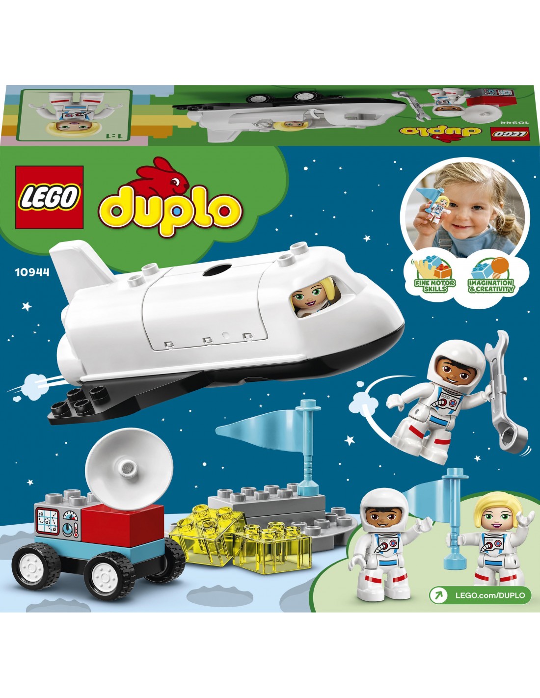 Zestaw LEGO® DUPLO® Town Lot promem kosmicznym LEGO® DUPLO® Town (10944) ucieszy małych astronautów i pomoże im rozwijać wyobraźnię oraz inne zdolności.