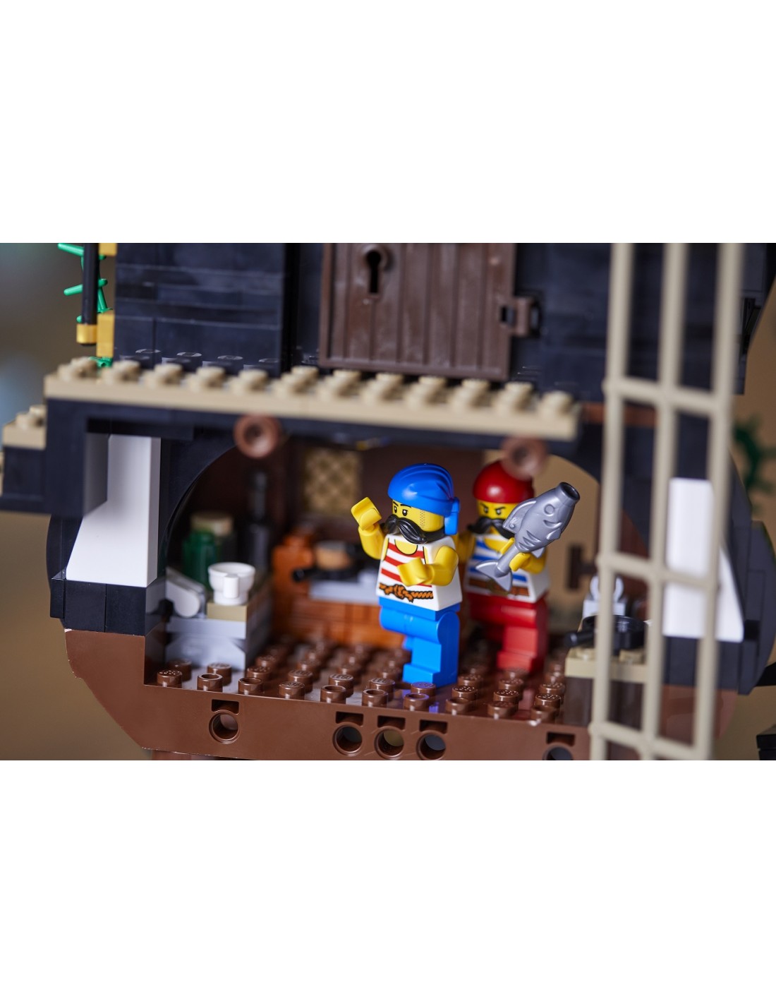 W zestawie znajdziesz mnóstwo inspiracji do odgrywania historii pełnych pirackich przygód, w tym kajutę kapitana, sklep z jedzeniem, kuchnię, sypialnie, dok zaopatrzeniowy, fermę, toaletę, celę więzienną, tawernę i ukryty skarb, a do tego wiele świetnych akcesoriów, osiem minifigurek piratów, wybrane figurki zwierząt i dwie figurki szkieletów. W zestawie jest wyspa, którą można podzielić na pół i przebudować. Wrak także można rozłożyć, a następnie przerobić na statek inspirowany modelem LEGO Barakuda Czarnych Mórz z 1989 r.