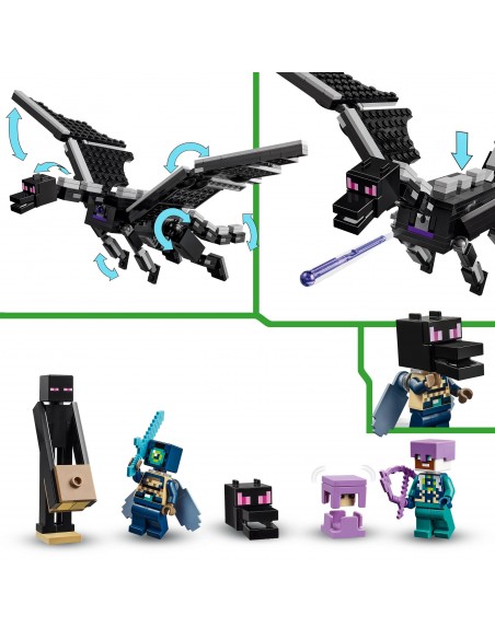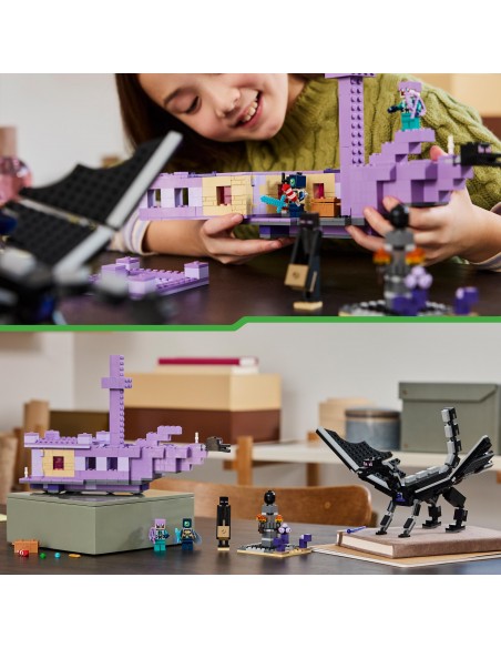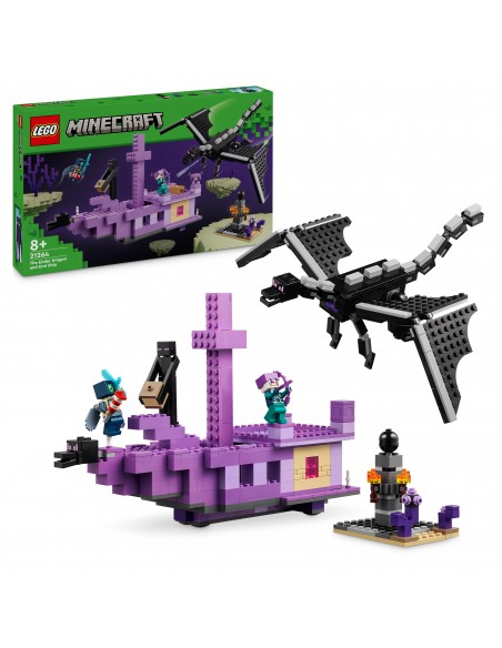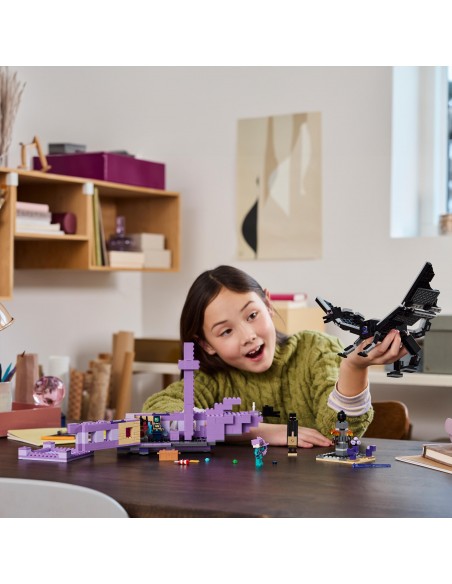 Głowę smoka na dziobie statku można zdjąć i nosić jako hełm. W środku dzieci znajdą statyw alchemiczny z miksturami zdrowia. Zestaw zawiera postacie z gry: badacza Kresu ze skrzydłami elytry i fajerwerkami, rycerza Kresu, Shulkera i Endermana. Akcesoria obejmują cenne jajo smoka. Dzieci mogą przybliżać i obracać modele w 3D i śledzić postępy dzięki fajnej i intuicyjnej aplikacji LEGO® Builder.